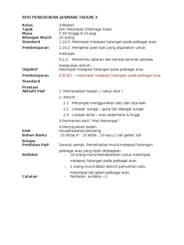 Boleh share rpt/rph bm tahun 2 & tahun 3 dan pj & pk tahun 1. Rph pendidikan jasmani tahun 1 adalah rancangan pengajaran harian yang perlu disediakan lebih awal oleh guru sebelum menjalankan sesi . Rancangan pengajaran harian mata pelajaran :